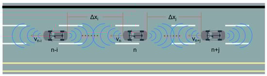 Assuming all vehicles travel along the road’s centreline, the lane-marking and road boundary potential fields become irrelevant. Consequently, there is no need to consider lane-changing behaviour or vehicle deviation angles in this scenario. The intensity of the vehicle potential field exerted by the (n − i)th and (n + j)th vehicles on the nth vehicle can be expressed as follows. Figure 2 illustrates a multi-vehicle car-following scenario involving n + j vehicles (where both n and j > 0). The distance between the (n − i)th and nth vehicle is denoted as , while the distance between the (n + j)th and the nth vehicle is .