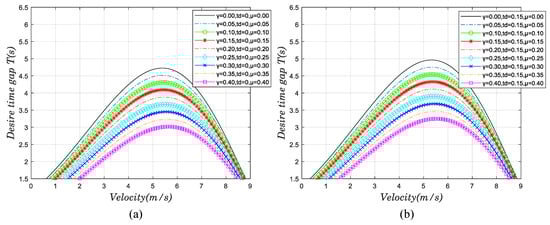 Following the stability condition (16), we obtain the stability curve for V-T by setting parameters , , , = 1, and , using additional parameters from Table A2. Figure 3, which demonstrates the stability curves for different values of and at of 0 and 0.15 [], reveals that the stability curves decrease as and increase, indicating that considering the safety potential field of leading and following vehicles can improve traffic flow stability. Furthermore, at identical and values, the unstable region for is larger than , suggesting that accounting for time delays can alter a vehicle’s motion state, thus impacting traffic flow stability.