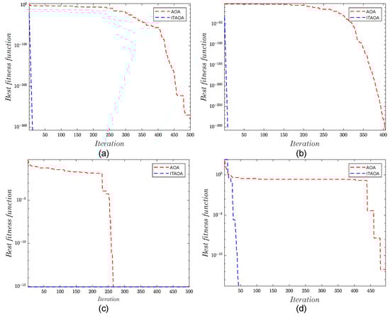 Comparison of convergence curves of different functions: (a) F1; (b) F2; (c) F10; (d) F11.