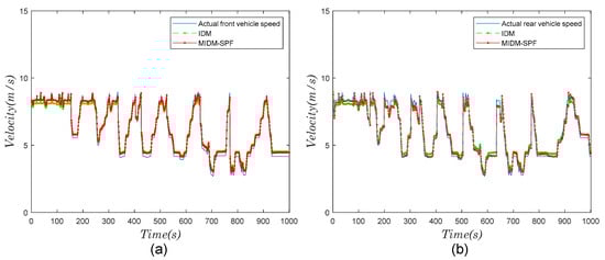 To evaluate the proposed model in this paper effectively, the IDM was also calibrated using the same dataset. The final trajectory results of both the MIDM-SPF and the IDM were compared, as illustrated in Figure 5. Figure 5a,b display the differences between the estimated trajectories of the leading and following vehicles and the actual data for both models. In these figures, the blue line signifies the actual trajectory of the following vehicle in the car-following scenario, the green dashed line represents the trajectory estimated using the IDM, and the red solid line depicts the trajectory based on the MIDM-SPF model.