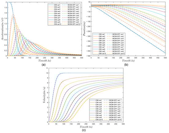Figure 6a reveals that the MIDM-SPF model achieves higher acceleration than the IDM at the same moment, reaching its maximum acceleration value in a shorter duration. Figure 6b,c show that the velocity distribution of the MIDM-SPF model attains its maximum value more rapidly within a brief period. This behaviour aligns with real-world driving at intersections, where vehicles typically strive to accelerate to the maximum speed quickly after a traffic signal change, ensuring safety to expedite passing through the intersection. Moreover, compared to the IDM, the MIDM-SPF covers a greater distance within the same amount of time, suggesting that the car-following scenario at the intersection can facilitate more vehicles passing through in a limited time, thereby significantly enhancing the efficiency of vehicle flow at the intersection.