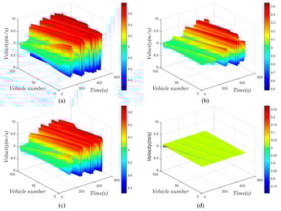 Figure 8a clearly demonstrates that, under the influence of disturbances, the space–time evolution of traffic flow, with both and μ = 0, is characterised by numerous folding bands. These bands, visible as multiple peaks and valleys on the time–space plane, signify that disturbances are continuously propagating and amplifying within the traffic flow. This leads to an unstable state, potentially manifesting as traffic congestion. In contrast, Figure 8b–d show that as the values of and μ incrementally increase, the undulations in the traffic flow’s time–space plot start to decrease, and the folding bands contract. When and μ = 0.29, the folding bands almost vanish, and the overall time–space evolution appears significantly flatter. This observation indicates that disturbances within the traffic flow are effectively mitigated, returning the traffic system to a stable state. The MIDM-SPF model is thus shown to effectively absorb disturbances within a car-following scenario, improving overall traffic flow stability.
