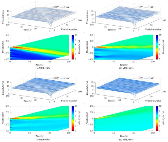 Numerical simulations were conducted for CAV market penetration rates (MPRs) of 0.2, 0.4, 0.6, and 0.8. At t = 0, a disturbance was introduced at the leading vehicle’s position to simulate emergency braking behaviour. The resulting velocity and position curves for different MPRs are displayed in Figure 9. In these figures, grey lines represent HDVs, and blue lines represent CAVs. Figure 9a reveals that at a 20% MPR, the disturbance causes significant velocity fluctuations, characterised by an oscillatory behaviour. As the MPR increases, as seen in Figure 9b–d, the extent of velocity fluctuations gradually reduces, the overall speed oscillation trend in the traffic flow diminishes, and the duration of fluctuation decreases. At an 80% MPR, the range of velocity fluctuations and the fluctuation duration are noticeably shorter. These observations suggest that a higher proportion of CAVs in mixed traffic flows can significantly enhance traffic flow stability.