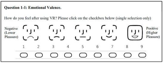The questionnaire’s first section assessed user emotions by using SAM to examine emotional valence and emotional arousal. Figure 5 provides an illustrative example, depicting question 1-1. Participants were instructed to follow the provided guidelines and select a checkbox item by item. Progression to subsequent questionnaire pages was permitted only after completion of the answers on the current page.