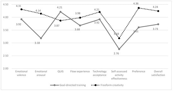 Freeform creativity outperformed goal-directed training across most indicators, including emotional responses (emotional valence and emotional arousal), flow experience, technology acceptance, preference, and satisfaction, with the differences reaching statistical significance. This implies that creative activities that allow free expression and exploration elicit greater pleasure and evoke stronger emotions. As a result, users perceive such technology as more useful, user-friendly, and enjoyable, fostering a willingness to continue its use. Moreover, freeform creativity enables users to concentrate more, enjoy the process, and experience a distortion of time, thereby facilitating deeper immersion in VR experiences.