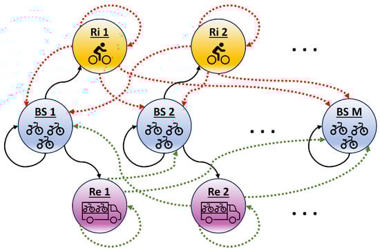State signifies that the bike is inside a bike station, and that it is only connected to itself, to state or to state (black solid connections). State indicates that the bike is involved in a ride performed by the client, and that it is connected to itself and to every single state BS (red dashed connections). State represents that the bike is transported by a vehicle that performs rebalancing, and that it is connected to itself and to every single state BS (green dashed connections), except the corresponding state . This exception is due to the uselessness of rebalancing, in which the bike is taken from a bike station only to be reintroduced into the same bike station.
