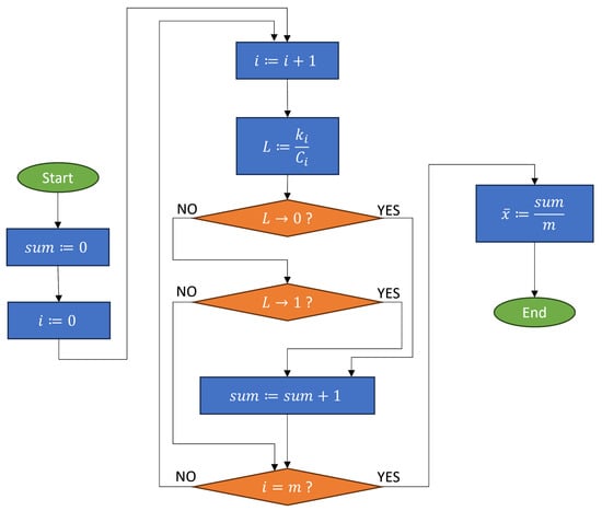 Figure 3 summarizes the method of computing the overall criticality (), using the information of the available bikes () and the capacity () of all the bike stations () from a subsystem comprised of m bike stations, , in the form of a flowchart that incorporates the concepts from Equations (1), (2) and (5)–(7).