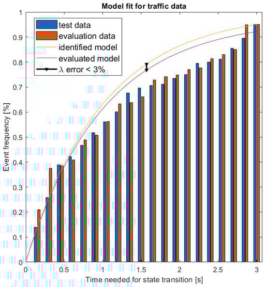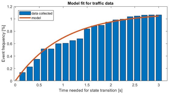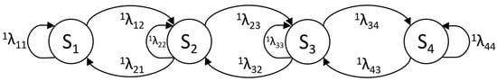So, from to , the transition probability is defined as an exponential distribution function, outlined in Equation (9), with frequency and mean value . The probability is dependent on the current state and is not influenced by past or future states.