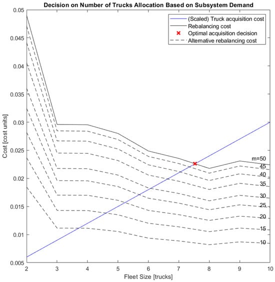 Within the practical evaluation strategy, the model together with the fleet sizing method were applied to the same subsystems. The selected rebalancing application was tested, to ensure that it operated within the maximum travel time restriction ( s) to each bike station during the rebalancing trip. The practical evaluation was also successful, due to the fact that all the underlying transition rates were within bounds derived from the mentioned studies of real world conditions of BSSs (25.5 km/h truck velocity; 2 km distance between stations). Additionally, the model effectively reached another operational goal by lowering the duration of the bike station unworking times, to a noticeable extent. Furthermore, in the context of user expectations, it demonstrated efficacy in decreasing the rate of lost customers, which is noteworthy, albeit without ensuring complete reduction, which is a limitation.