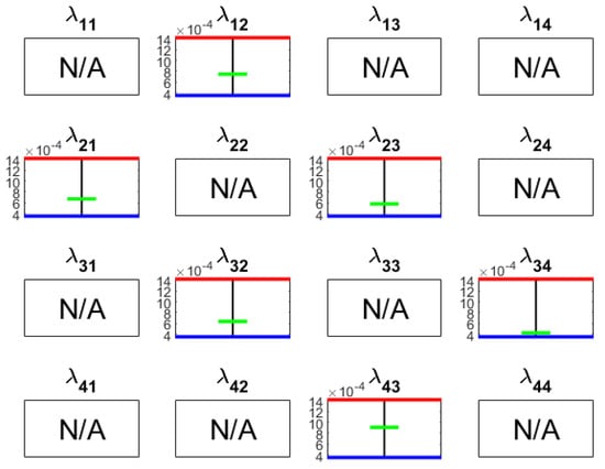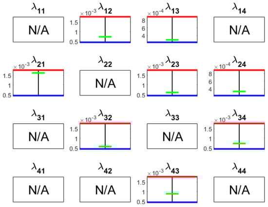A general statement that applies to historical data collected from Citi Bike is as follows: The rate of transition between states whose percentage ranges are adjacent (rates highlighted with bold text in Equation (10)) is much higher compared to the rest, formalized in the equation below: