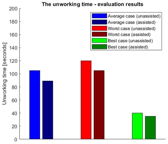 Based on the customer feedback mentioned in published studies [], the improvement caused by decreasing the unworking times by 15–20% from values around 100 s was noticeable by the end users. So, the results of the “assisted” cases justified the usage of the model.