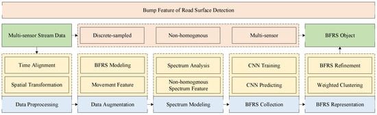 Based on the analysis of related studies, there are intentions for designing the BFRS detection method using smartphones. With the multi-sensor stream data collected at three different urban areas in Nanjing, China, experiments were conducted based on the proposed method. This section introduces the methodological framework and implementation details for BFRS detection. Different from the traditional IoT sensor, it does not extensively describe the data acquisition and measurement process across different sensors or vehicles. Instead, it focuses on acceleration, orientation, and GPS data acquired from smartphones’ built-in motion sensors. Here, smartphones, placed in vehicles in arbitrary positions, record the vehicle’s location, orientation, and acceleration changes during travel. This allows for the analysis of trajectory records to extract vehicular movement features on the road, such as speed and direction of movement. Subsequently, spectral analysis techniques [38] are employed to represent the spectral features of the acceleration sampling data, which does not rely on direct numerical changes in acceleration to measure BFRS due to inherent sensor noise. Additionally, by simulating different vehicular movement situations based on these movement features, data augmentation is applied to the limited neural network training dataset to enhance the extraction of BFRS and improve the accuracy of the neural network. Finally, the results detected by the CNN [39] are integrated using a mean-shift-based weighted clustering method [40] to represent BFRS.