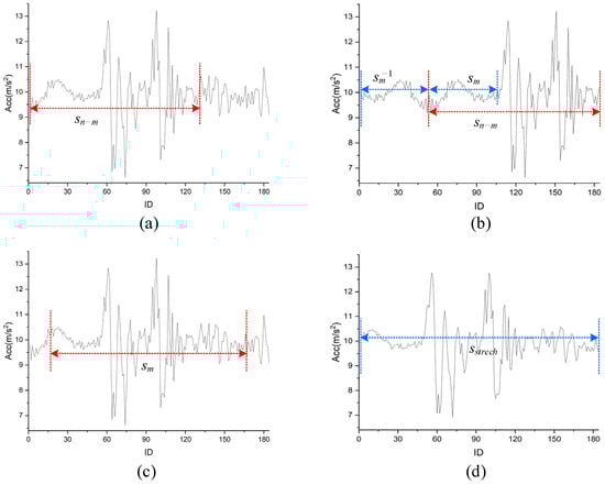 In the BFRS modeling process, it is recognized that vehicles travel at varying speeds, which influences the detection of BFRS based on recordings and movement features. While multi-sensor recordings are captured at specific times and locations, they are inherently logged at a singular speed, omitting the diversity of speed scenarios encountered in real-world driving. To address this limitation, a simulation process that accounts for varying driving speeds is necessary to accurately model BFRS under different speed conditions. Let us assume the vehicle’s average speed is , and the number of multi-sensor recordings is n. To construct more realistic scenarios, it is essential to simulate speeds within a range . The original recording s is then modified based on the comparison between and . If v > v′, indicating slower driving conditions, the sampling period of BFRS is extended, and the recording s is stretched. Conversely, if v < v′, suggesting faster conditions, the recording s is compressed. These stretching and compressing operations are executed using up-sampling and down-sampling methods, respectively. This augmentation is repeated k times with randomly selected speeds . For instance, when v > v′, a scale factor u is calculated, and only m samples are chosen (as depicted in Figure 3c). To maintain the same length as the original recording s, up-sampling is performed through linear interpolation, resulting in (illustrated in Figure 3d), interpolated with n timestamps to match the length of s.