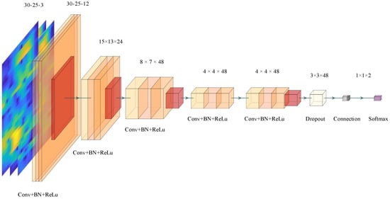 In this article, a simple CNN model is designed and applied with 5 convolutional layers, 5 batch normalization layers, 5 activation layers, 4 pooling layers, 1 dropout layer, 1 fully connected layer, 1 softmax layer, and 1 classification layer. The 3-axis acceleration data are initially encoded as a spectrum feature in dimensions of 30 × 25 × 3 and converted to the size of 30 × 25 × 12 by the first round of convolution operations, followed by the batch normalization. Then, the process is repeated for the other four times, with the dimensions becoming 15 × 13 × 24, 8 × 7 × 48, 4 × 4 × 48, and 4 × 4 × 48, followed by the dropout, fully connection, and softmax operations with dimension finally becoming 1 × 1 × 2. Through these operations, the CNN model can “hear” the voice of the road surface and detect BFRS from the input dataset. The detailed structure is depicted in Figure 5.