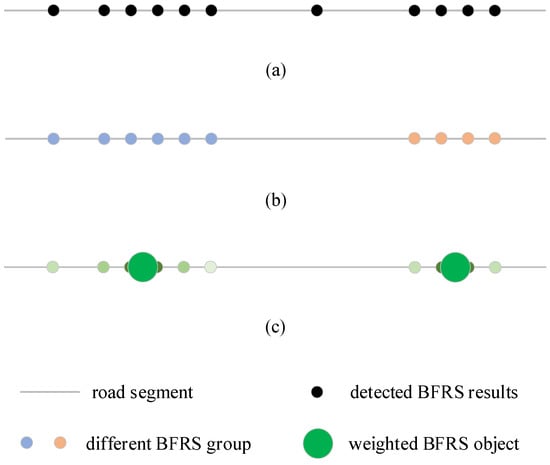 BFRS detection results. (a) BRFS detected results colored with probability. (b) Segmented and refined as different BFRS groups. (c) Represented by weighted cluster center.