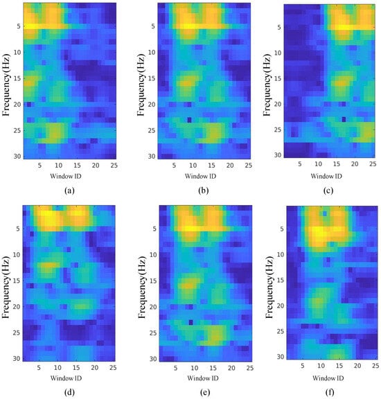 Since the abnormal change in BFRS is recorded twice by the front wheel and back wheel of vehicles, as depicted in Figure 2, the sliding window length lw of the BFRS to generate spectrum is set as 170, which can cover the average abnormal change under the speed condition km/h according to (4). Moreover, the frame duration is set as 50, the hop duration is set as 5, and the specific frequency Hbfrs of BFRS ranges from 3 to 50 Hz, based on the BFRS modeling result in Section 3.2. Assumption that the original acceleration recording is depicted in Figure 4a–c, the spectrum computed based on FFT is depicted in Figure 4d–f. It can be observed that abnormal changes in the original recordings are distributed along the time direction from the spectrum view, and the feature of the abnormal change can be represented by frequency domain. The heavier changes in the acceleration, the brighter (represented by the yellow color, in respect to the blue color) the color in the frequency domain. Moreover, compared with one-dimensional changes in the original acceleration recording in the upper row, abnormal changes in the low row are depicted just like the magnifier in the frequency domain, and the directional non-homogenous feature can be more clearly represented.