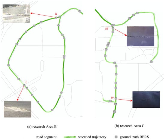 In Figure 14, different kinds of BFRS in research Area B and C are visualized as the related pictures of (i) cracks, (ii) speed breaker, (iii) transverse gutter, and (iv) pothole. The detailed statistics of the collected multi-sensor stream data are depicted in Table 3.