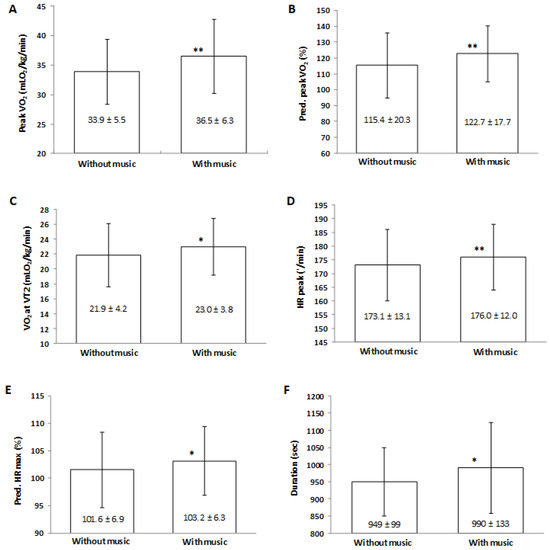 Cardiorespiratory parameters and test duration of CPET without music and while listening to synchronized motivational music. (A) Peak oxygen consumption (Peak VO2), (B) predicted peak oxygen consumption (Pred. peak VO2), (C) oxygen consumption at second ventilatory threshold (VO2 at VT2), (D) peak heart rate during exercise (HR peak), (E) predicted maximum heart rate (Pred. HR max), (F) test duration (Duration). Whiskers extend between ± one standard deviation. * p < 0.05; ** p < 0.01, significantly different from without music.