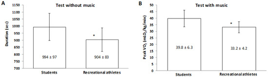 Differences between the group of students and the group of recreational athletes when tested without music and while listening to synchronized motivational music. (A) Test duration (Duration) without music, (B) peak oxygen consumption (Peak VO2) with music. Whiskers extend between ± one standard deviation. * p < 0.05, significantly different from the group of students.