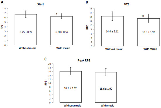RPE at three time points during CPET without music and while listening to synchronized motivational music. (A) RPE at the start of CPET, (B) RPE at VT2, (C) Peak RPE. * p < 0.05; ** p < 0.01, significantly different from without music.