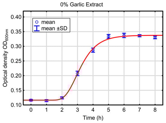 Regarding the parameter estimates, the highest values of the maximum bacterial growth rate and the highest OD level in the stationary phase were observed in samples without the addition of garlic extracts, whereas E. coli activation in these tests occurred relatively quickly, after approximately 2 h.