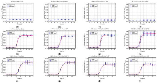 Graphical presentation of the dynamics of Escherichia coli ATCC 25922 growth, expressed as optical density at 600 nm (OD600nm), on nutrient broth with 2% glucose supplemented with 2% (a–d), 0.5% (e–h), and 0.25% (i–l) extracts based on raw (a,e,i) or dried at 50 °C (b,f,j), 70 °C (c,g,k), and 90 °C (d,h,l) garlic over time. The solid lines represent the predictive model responses, while the empty points denote mean values of experimental data. Bars represent standard deviation (SD) of six measurements.