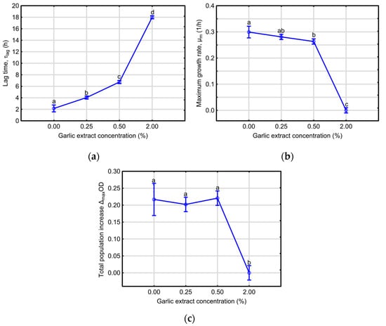 The impact of garlic extract concentrations (2%, 0.5%, 0.25%, 0%) on the kinetic parameters of Escherichia coli ATCC 25922 growth: (a) the lag time (τlag), (b) the maximum rate of exponential growth (μmax), and (c) the total bacterial population increase (ΔmaxOD). Variables sharing the same letter: a, b, c, or d indicate no significant differences (p > 0.05); bars represent a confidence interval of 0.95.