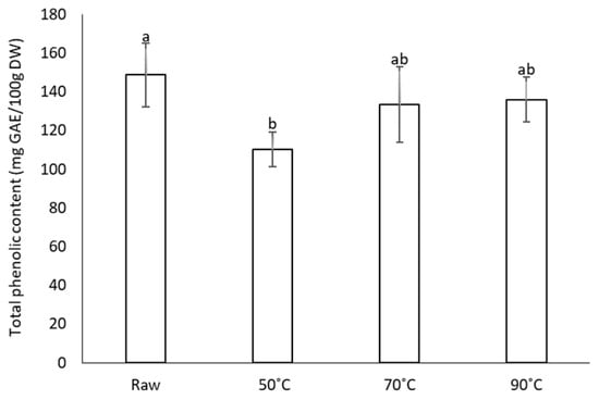 The effect of the drying process at different temperatures on the total phenolic content in garlic slices. Bars represent standard deviation (SD) of six measurements. Variables with the same letter are not significantly different (p > 0.05).