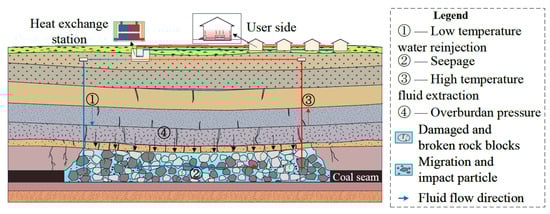The broken rock mass in goaf exhibits the characteristics of high porosity and a high ratio of heat exchange surface area [], which contributes to increasing the water storage capacity and heat exchange efficiency in geothermal exploitation projects in abandoned mines. Furthermore, goaf areas also possess advantages such as large water storage capacity, stable temperature, and high enthalpy, making them particularly suitable for the storage of water and heat resources after closure and renovation []. However, under long-term overlying loads, the fractured rock mass in goaf areas is prone to compaction deformation and rock block damage, which alters the void structure and thus affects permeability characteristics []. Simultaneously, the movement of broken micro-rock particles within the void structure of broken rock mass and their collision with the rock mass skeleton alter the deformation and fracture characteristics of rock blocks, thus impacting the efficiency of geothermal energy extraction. The process of geothermal exploitation in abandoned mines and its influence on the deformation and movement characteristics of broken rock masses in goaf areas are illustrated in Figure 1. The red arrows in Figure 1 represent the heat flow migration direction and the black arrows represent the load on the caving zone by overlying rock.