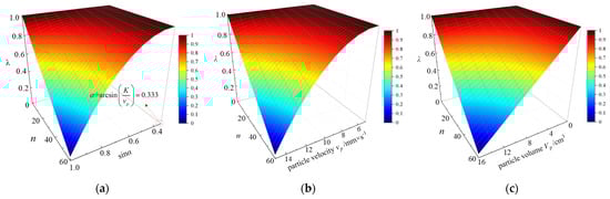 The independent variables in Equation (6) are particle volume Vp, impact velocity vp, impacting time n, and impact angle αn. There is a clear positive correlation between impacting time n and the dependent variable bond radius multiplier λ. However, further analysis is needed to characterize the relationship between the other parameters and the bond radius multiplier λ. This study investigated the effects of particle volume Vp, impact velocity vp, and impact angle αn on bond radius multiplier λ. Figure 2a–c illustrates the influence of impact angle αn, impact velocity vp, and particle volume Vp on bond radius multiplier λ, respectively (assuming nc = 60 and K = 0.5 mm/s).
