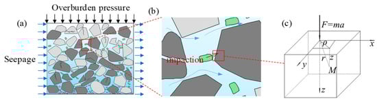 Schematic diagram for calculating the impact ranges of impact effects on rock blocks. (a) Distribution diagram of fractured rock mass in goaf; (b) Schematic diagram of the impact of rock particles on the broken rock mass in goaf; (c) Simplified diagram of the force on the rock block affected by impact erosion.