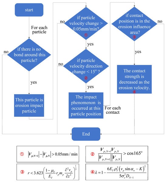 Based on the proposed strength erosion calculation model for impact, a secondary development was conducted on the broken rock mass numerical model under water immersion and lateral compression conditions. It is assessed based on the presence or absence of constraints around the particle to determine whether a particle is an impact particle in the numerical model. The impact position of particles and the range of strength erosion influence are determined by Equation (11), and the specific procedure is illustrated in Figure 4. Considering the coordination between computational speed and accuracy, the model traverses all particles and updates data on impacted particles and erosion areas every 3000 steps. In the formula in Figure 4, Vp is the vector form of particle impact velocity, with subscripts N and N + 1 denoting the running process of erosion position determination code for the Nth and (N + 1)th times, respectively.