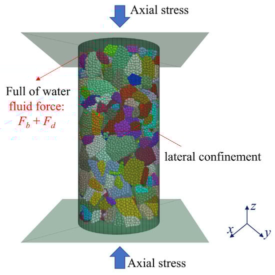 The software PFC3D7.0 is widely used to simulate particle breakage by the debris replacement method and the bonding combination method [], and it was used to establish the broken rock mass specimen in this study. The schematic diagram of the numerical model of particle discrete element under compression loading of broken rock mass under the conditions of flooding and lateral confinement is shown in Figure 5 []. We utilized the digital rock method to better align the established broken rock mass specimen with real-world conditions [,,]. This numerical model can simulate the deformation and fracture characteristics of broken rock masses with different size gradations in goaf during geothermal mining in abandoned mines.
