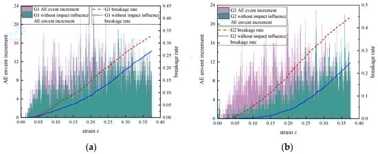 The influence of impact-induced strength erosion on the AE events of broken rock mass and breakage rate with different size grading distributions was compared, and the results are shown in Figure 9.