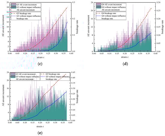 The evolution of the AE event increment and breakage rate. (a) AE event increment and breakage rate with size grading G1; (b) AE event increment and breakage rate with size grading G2; (c) AE event increment and breakage rate with size grading G3; (d) AE event increment and breakage rate with size grading G4; (e) AE event increment and breakage rate with size grading G5.