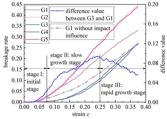 Combined with Figure 8, according to the trend similarity of the stress–strain curve, these five kinds of grading size broken rock masses can be divided into two groups: Group 1 with G1, G2, and G5; Group 2 with G3 and G4. To discuss the two groups’ differences in breakage rate characteristics, we take G1 vs. G3, for example, as shown in Figure 10. The difference value of the breakage rate between G1 and G3 increases until Stage III, then decreases during Stage III, and the maximum difference value is 0.094.
