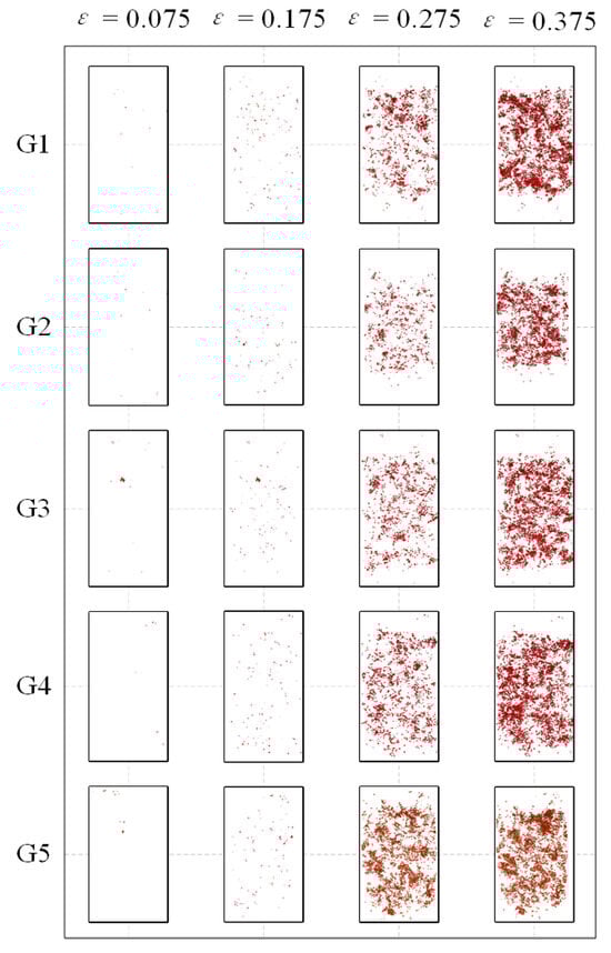 According to Figure 11, as the broken rock sample is loaded, the cracks disperse when ε is less than 0.175. This is because, as a granular material, broken rock causes adjacent rock blocks to undergo squeezing and occlusion actions under compression load. The stress concentrates at the edges of these occlusion blocks, leading to crack formation. This corresponds with the conclusion in reference [] that compressed loads on broken rock masses can easily cause fractures at the edges of rock blocks. Therefore, during the initial loading stage, microcracks are more dispersed in distribution, which is similar to the reference study []. This contrasts with jointed rock masses, where initial microcracks tend to concentrate at the joints, particularly near the joint tip []. After the post-loading stage, when the strain reaches 0.275, crack propagation accelerates and exhibits a clustered distribution. When the strain reaches 0.375, cracks form a mesh-like pattern with enhanced connectivity. However, due to a significant reduction in porosity, the overall connectivity of broken rock mass decreases. The evolution of porosity in broken rock masses will be further discussed in the next section.