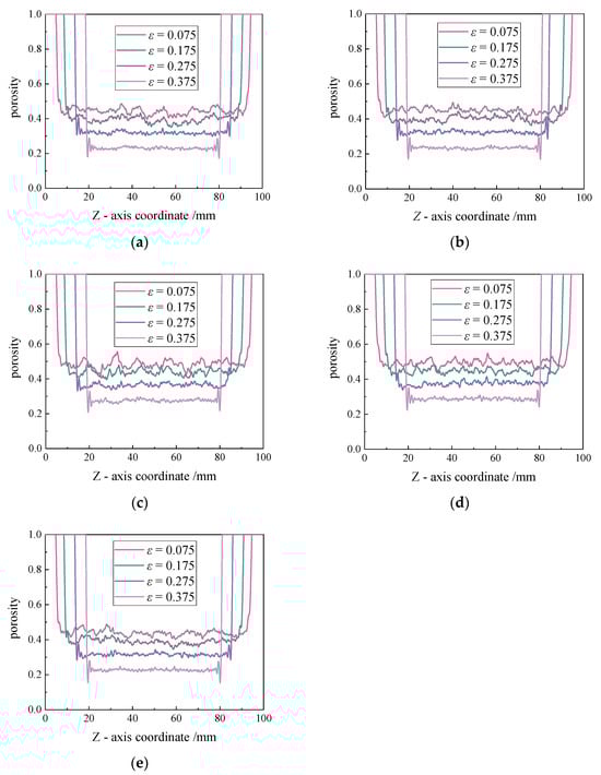 Porosity is an important fundamental parameter in the evolution process of broken rock masses []. Different from previous studies on the porosity of broken rock mass [,,], this paper innovatively uses the slice method to visually display the porosity change along broken rock mass in the Z-axis space, which can more accurately study the spatial distribution characteristics of porosity along the seepage direction and provide a better theoretical basis for the evaluation of the permeability characteristics of thermal storage mine water. The model was divided into 1000 slices along the z-axis at different strain levels of 0.075, 0.175, 0.275, and 0.375, and the corresponding porosity of each slice with different size grading distributions in the broken rock mass was recorded, as shown in Figure 12.
