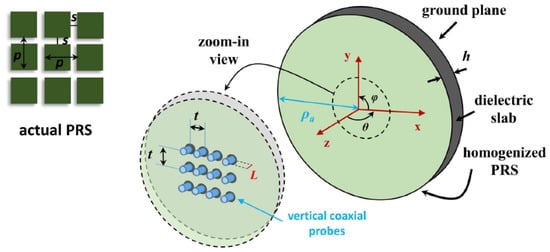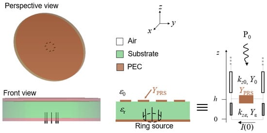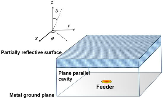 A plane-parallel cavity represents the core of the structure, enclosed by a metal ground plane and a partially reflective sheet (PRS), either uniform (e.g., a high-permittivity superstrate) or quasi-uniform (e.g., a periodic metal screen with spatial periods that are small with respect to the free-space wavelength) [,] (see Figure 1).