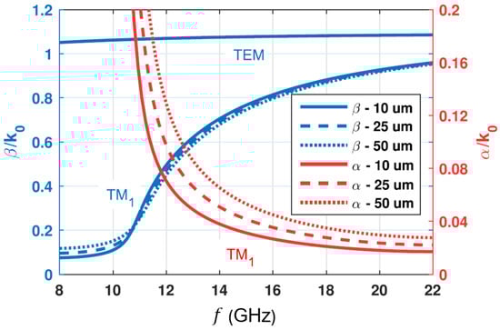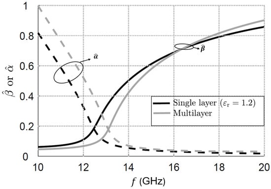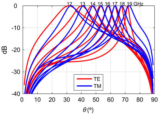 where the hat indicates the normalization of radial phase and attenuation constants and , respectively, by the free-space wavenumber (additional general pattern-related formulas may be found in [,,], for a great variety of cases encountered in applications). The normalized radial wavenumber typically shows a frequency-dispersive behavior. Therefore, as a consequence of (1), to perform an elevation scan (and also potentially change the elevation beamwidth), it is sufficient to vary the operating frequency [,,].