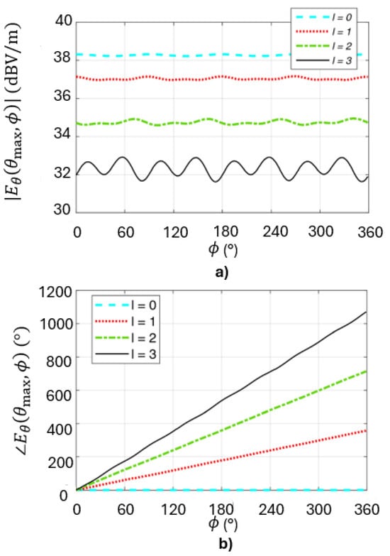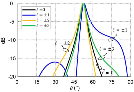 In a real-world scenario, OAM applications have limitations, mainly due to the phenomena of strong attenuation and fading [,]. One distinct issue consists in finding a suitable method of successful OAM excitation. It has been demonstrated that the most versatile method consists in circular arrays, which can be properly phased to obtain a radiated field transporting a given momentum. By switching from one inter-element phase difference value to another, the order of the momentum is varied. An issue for the latter scheme in the free-space configuration is the unavoidable dependence between the pointing angle and ℓ, as can be inferred from the expression of the radiation pattern below (2):