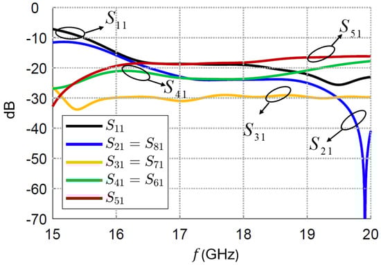 In Figure 5, the magnitudes of the scattering parameters are reported, demonstrating values lower than the −18 dB threshold, hence confirming an excellent excitation performance.
