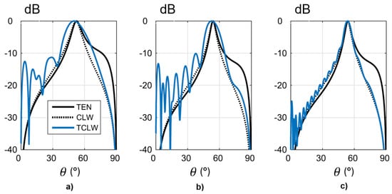 Cylindrical leaky-wave model, truncated cylindrical leaky-wave model, and reciprocity-obtained elevation pattern (TEN) at 16 GHz. (a) s = 50 μm, (b) s = 10 μm, (c) as in (b) but radiating 99% input power. Reproduced from [].