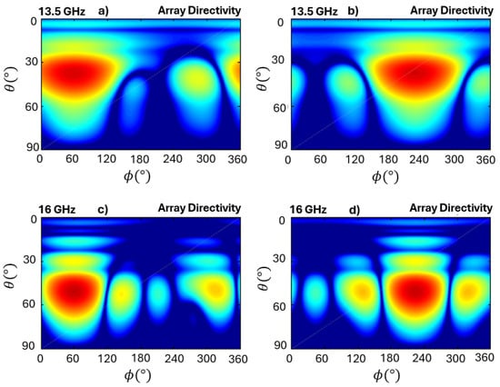 where AP(, ) corresponds to the array pattern, EP(, ) to the element pattern, and to the scalar array factor. An expression for uniform arrays may be found in [] for different planar geometries. Beam-shaping effects are shown, for multiple frequencies, in Figure 11, through directivity patterns.
