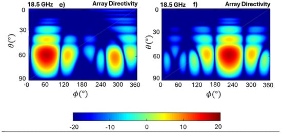 Directivity colormaps in the -plane for an array-fed FPCA, for multiple frequency values and two main beam azimuth planes. (a) GHz, , (b) GHz, , (c) GHz, , (d) GHz, , (e) GHz, , (f) GHz, . Reproduced from [].
