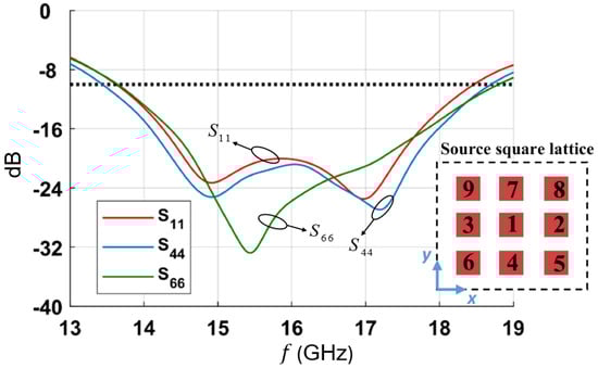 Input reflection coefficients for a 3 × 3 square planar VEDs array inside an FPCA. The horizontal dashed black line corresponds to the −10 dB threshold. Reproduced from [].
