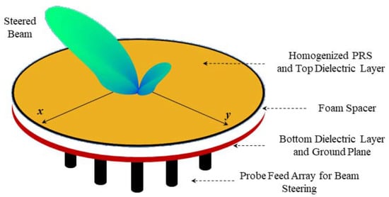 Fabry–Perot cavity antennas find application in polarization reconfigurability and beam scanning. The demand for circular polarization is rapidly growing in the civil, medical, and military sectors, due to a number of advantages, such as the absence of orientation matching, resilience to multipath fading, and possibility to overcome obstacles on the propagation path []. Linear to circular conversion is a solution that may avoid complex geometries, to produce conditions of phase quadrature and magnitude equality on both horizontal and vertical field components. Once again, the 2-D LWAs and low-complexity standards required by relevant feeders may effectively simplify the design.