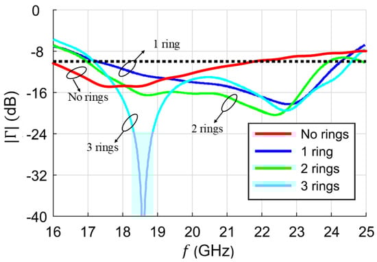 Simulated values for reflection coefficient magnitude, considering different numbers of via-rings. Inserting more concentric rings the reflection coefficient dip shifts to higher frequencies. The horizontal dashed black line corresponds to the −10 dB threshold. Reproduced from [].
