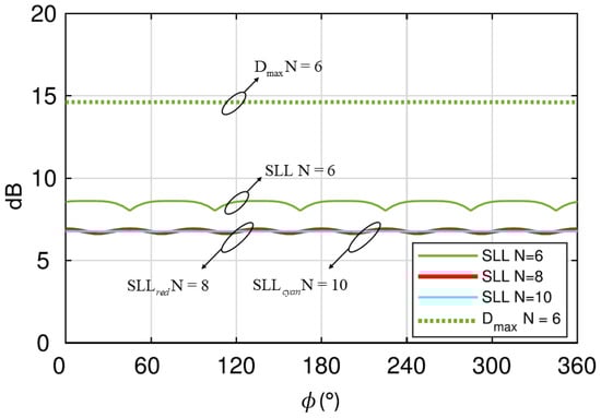 FPCA fed by a circular array with N elements: Simulated maximum directivity for (green dotted line) and main sidelobe level at 20 GHz for with (solid lines). Reproduced from [].