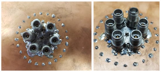 A comparison between square and circular planar arrays was also performed, finding out that the azimuthal symmetry of the latter induces a saturation of the maximum gain obtained by the overall antenna when the number N of coaxial probes is larger than or equal to 6. The circular symmetry of the feeding array impresses full azimuthal stability to the value of the gain; interestingly, the same is true for the first sidelobe level, which remains stable above a certain number of array elements, maintaining, as the main beam, a perfect symmetry as shown in Figure 15. Additionally, by increasing the number of elements in the source ring, the sidelobe level shows little or no sensitivity after 8 elements are reached. The feeding-network system of a prototype realized with N = 6 coaxial cables is shown in Figure 16, where two concentric rings of via holes are inserted to ensure broadband impedance matching.